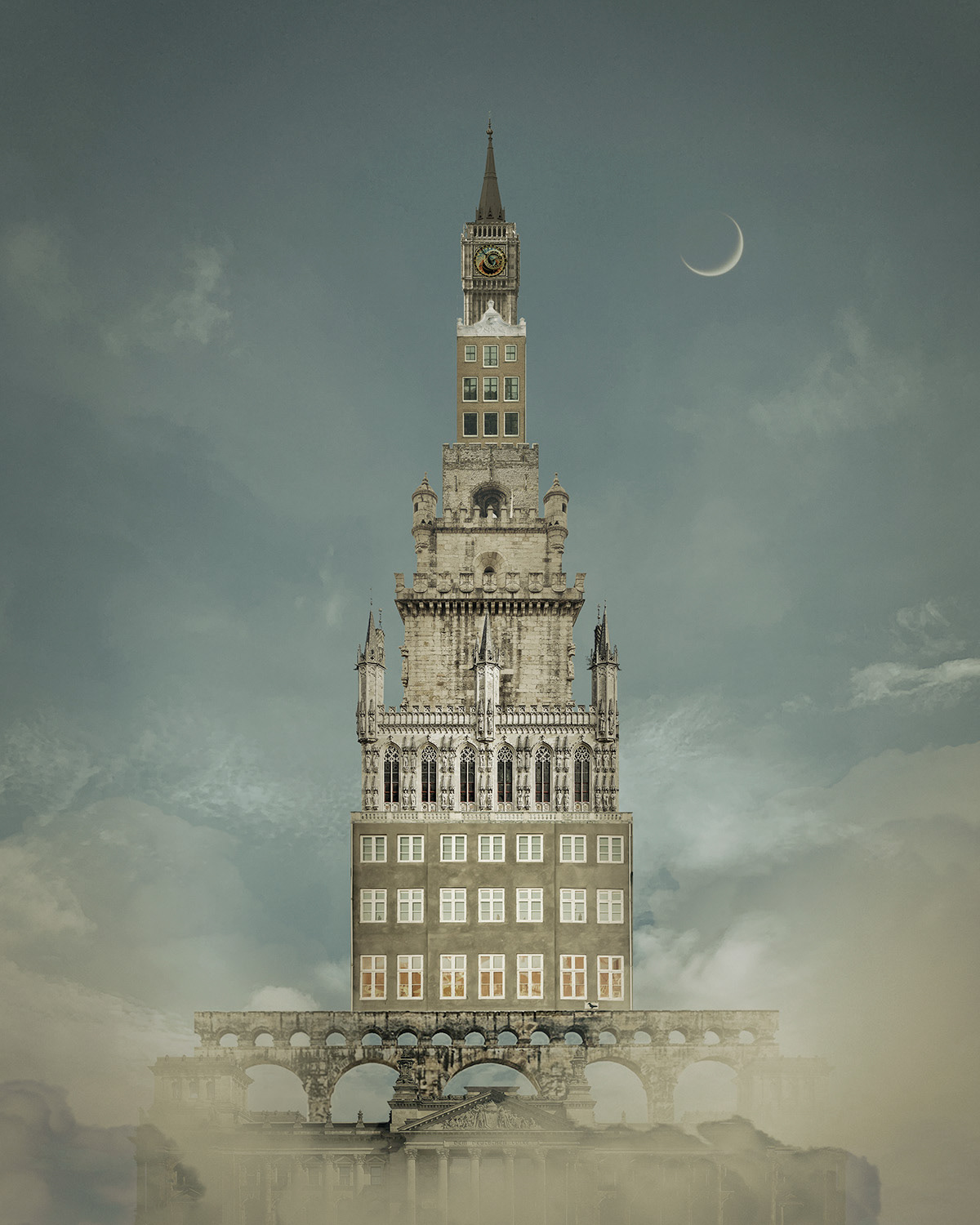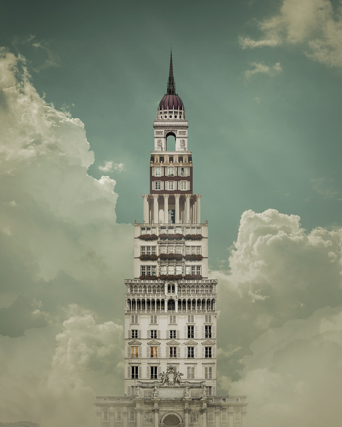 Hypercollage, each piece is composed of at least 15 images, inspired by the surreal, architectural style of