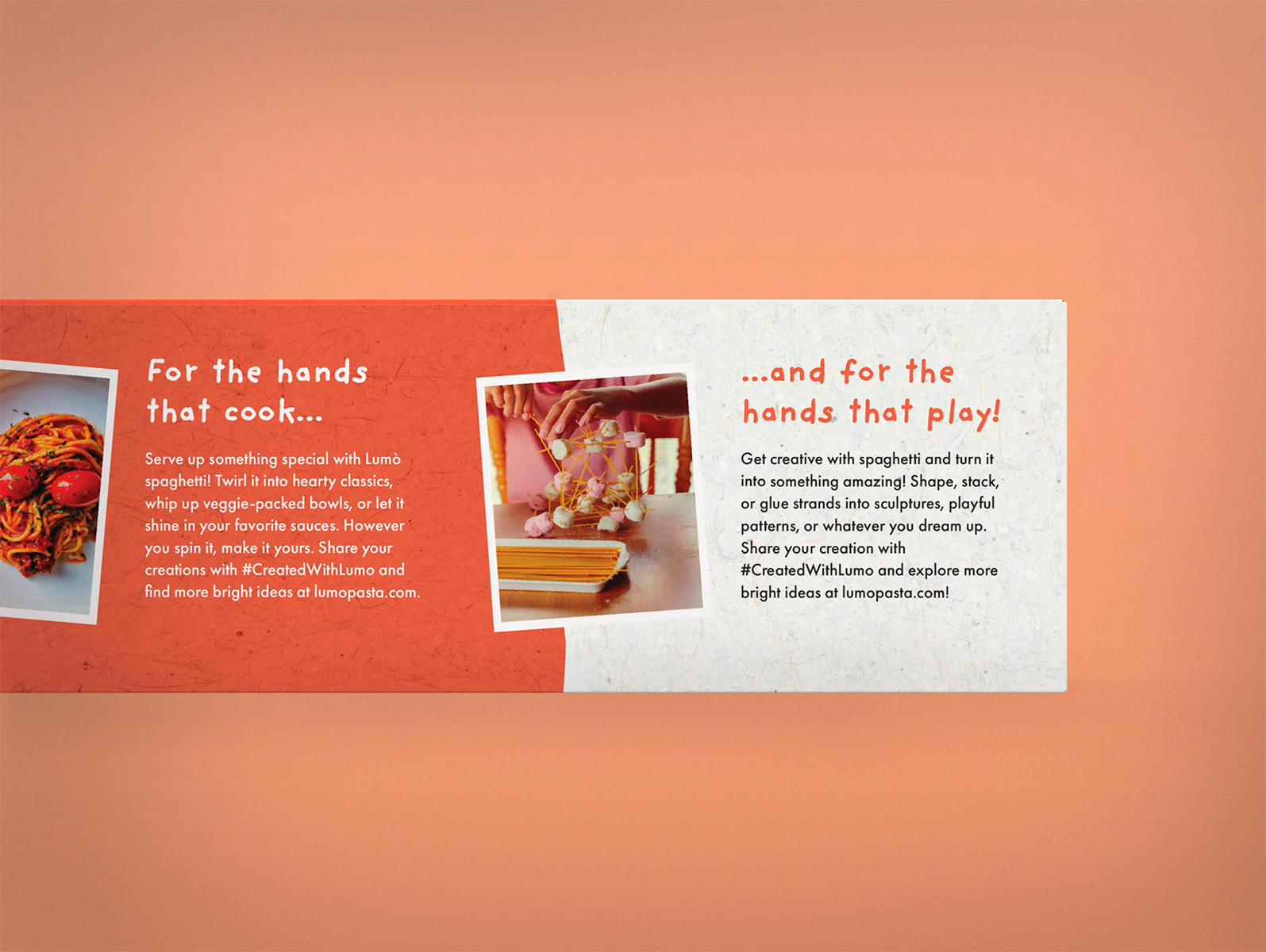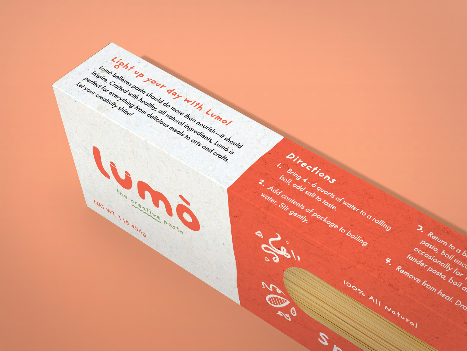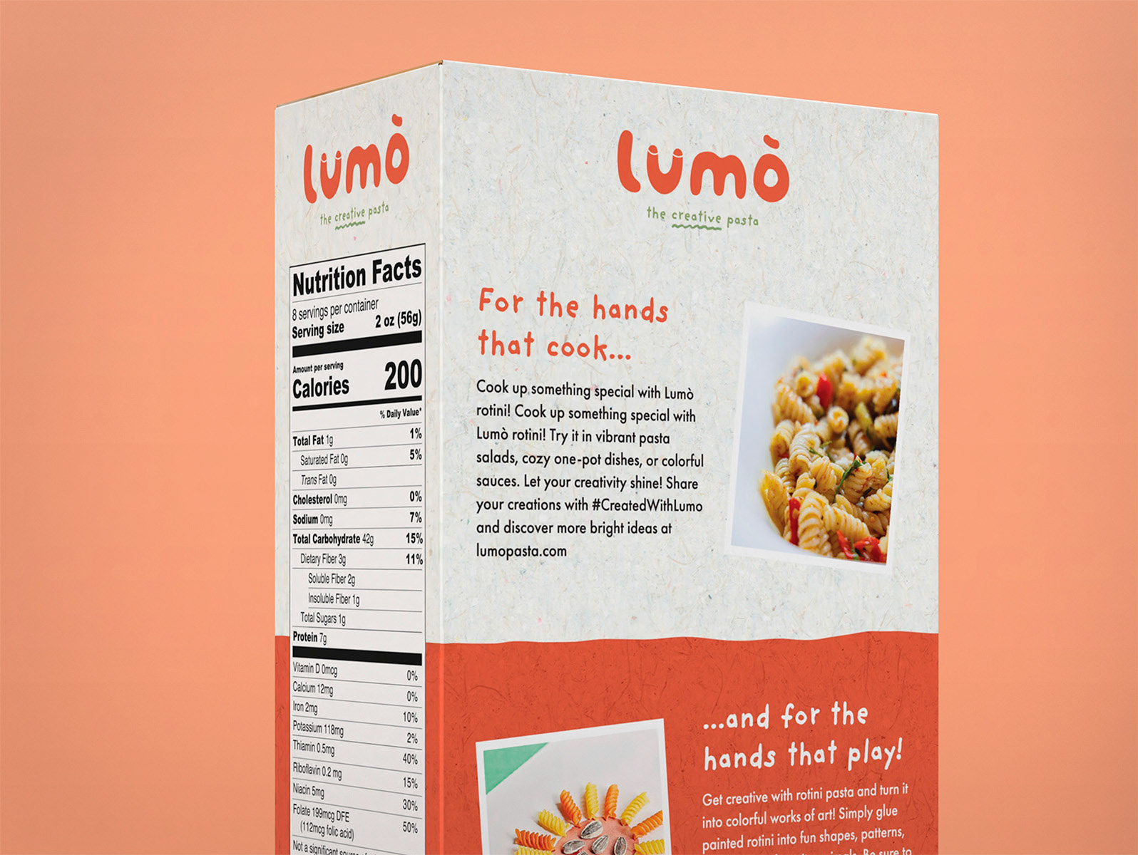 Branding and packaging for Lumò, a pasta brand that encourages creativity and connection across generations—or, “for the hands that cook and for the hands that play.” Aimed primarily at parents with young children, the brand’s core concept is expressed through playful, crafty packaging designed to spark nostalgia and inspire shared creative experiences. I designed the logo and two box types—one for short pasta and one for longer shapes.